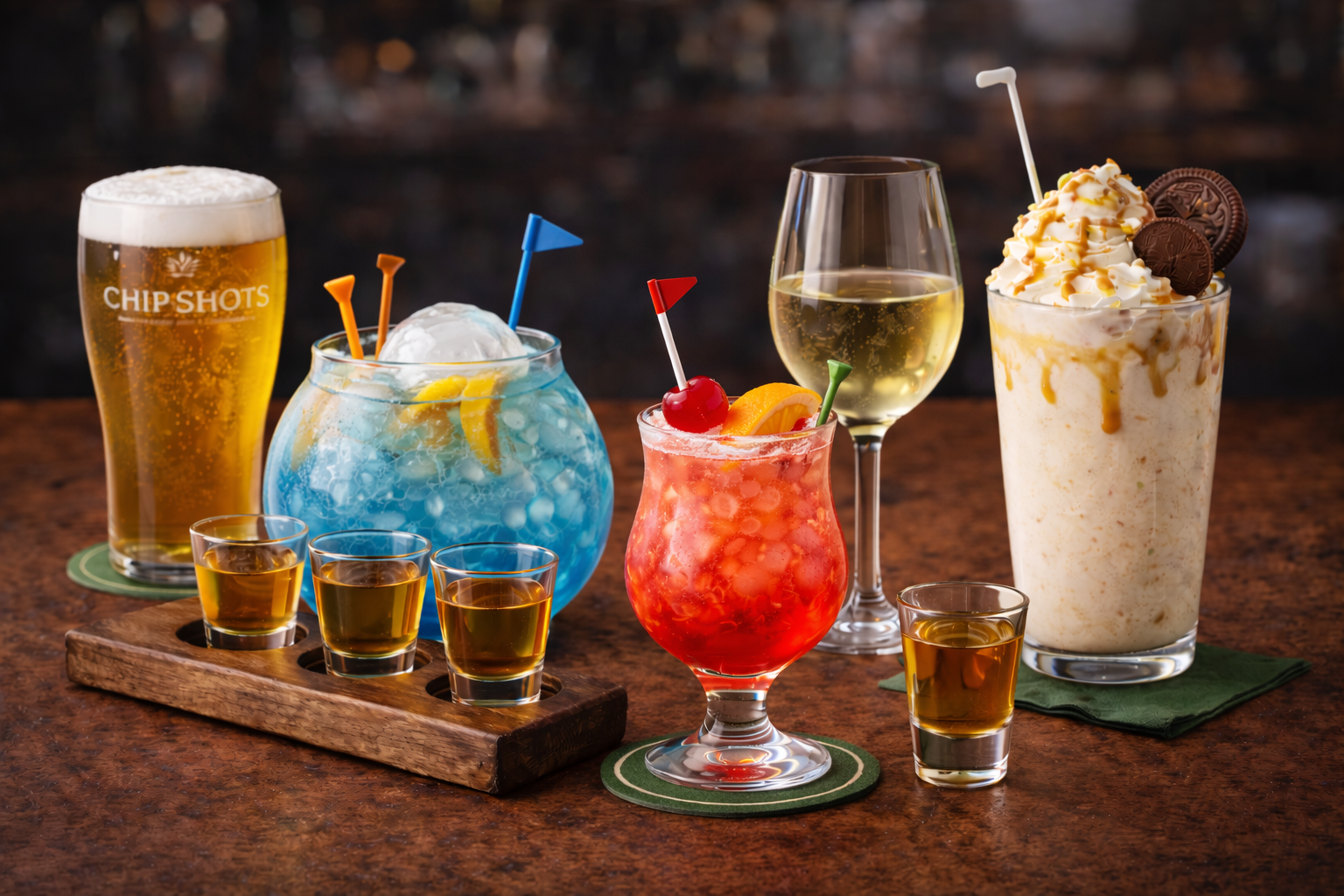 A full-service bar built for golfers and good times. From ice-cold draft beer and crafted cocktails to tasting flights, boozy milkshakes, and refreshing zero-proof options, our drink menu is designed to keep the fun going—on and off the course.